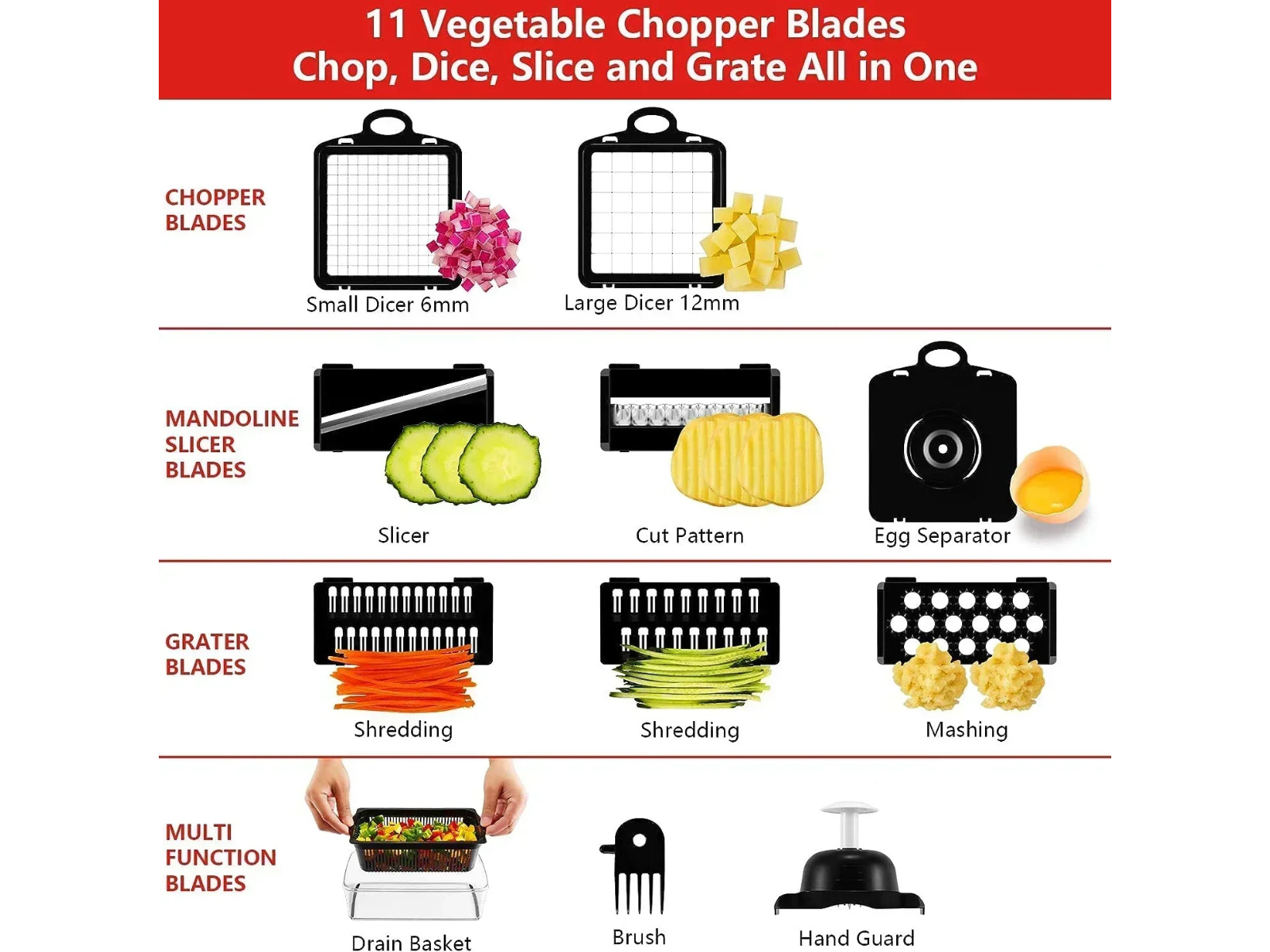 Space-Saving Design: Combines slicer, cutter, dicer, and shredder in one compact tool.